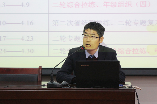 最后,牟主任就二轮复习进行指导培训,他以《夯实基础,精准备考》为题,以“巩固、完善、综合、提高”为纲,为同学们进行二轮复习指导。他要求在最后的拼搏时刻,同学们要构建更加完备的知识体系,并落实到位,最大程度的成长自我,对得起老师三年来辛勤的付出,对得起父母十几年来殷切的希望,更对得起自己十年寒窗苦读挥洒的汗水,无悔青春,向着自己坚定的目标冲刺!高考一百天,我们准备好了!