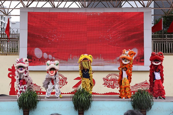 大会伊始,伴随着气贯长虹的《男儿当自强》音乐的响起,我校舞狮团队员登上舞台,五只小狮子在舞台上竞相舞动,精湛扎实的表演赢得了观众们的阵阵掌声。随后主持人上场,宣布大会正式开始。升国旗、唱国歌,全场师生起立,用自己嘹亮的歌声表达出对祖国的热爱。随后师生合唱《我和我的祖国》,将全场的气氛推向高潮。